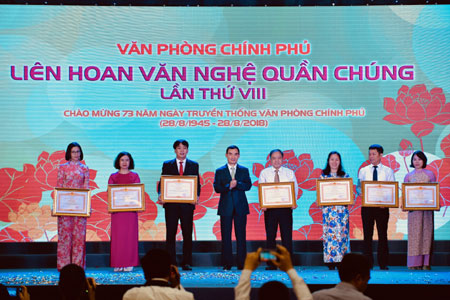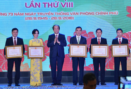 Đồng thời, công bố Quyết định tặng Bằng khen của Thủ tướng Chính phủ cho 2 tập thể: Trung tâm Hội nghị Quốc gia, Trung tâm Hội nghị 37 Hùng Vương và 9 cá nhân gồm: Vụ trưởng Vụ Quan hệ Quốc tế Lê Hồng Lam, Cục trưởng Cục Quản trị Đỗ Tuấn Dũng, Phó Vụ trưởng Vụ Hành chính Nguyễn Tất Vinh, nguyên Vụ trưởng Vụ Kế hoạch Tài chính Phạm Thị Thu Hà, Vụ trưởng Vụ Kế hoạch Tài chính Phạm Thị Kim Oanh, Hàm Vụ phó Vụ Kế hoạch Tài chính Nguyễn Lan Phương, Hàm Vụ phó Vụ Kinh tế tổng hợp Nguyễn Thị Thu Nguyệt, Phó Trưởng phòng Phòng Tài vụ, Cục Quản trị Hoàng Hồng Hạnh, Phó Trưởng phòng Phòng Quản lý nhà làm việc Chính phủ, Cục Quản trị Trịnh Văn Dũng.