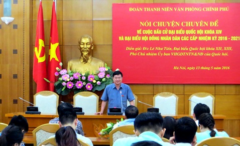 Tại buổi nói chuyện, các đoàn viên, thanh niên VPCP đã được nghe đồng chí Lê Như Tiến, đại biểu Quốc hội khoá XII, XIII, Phó Chủ nhiệm Uỷ ban VHGDTNTN&NĐ của Quốc hội phổ biến những điểm mới của Luật Bầu cử Đại biểu Quốc hội và đại biểu HĐND các cấp, trong đó có quyền bầu cử và ứng cử của công dân; nghĩa vụ, trách nhiệm của cử tri trong công tác bầu cử.