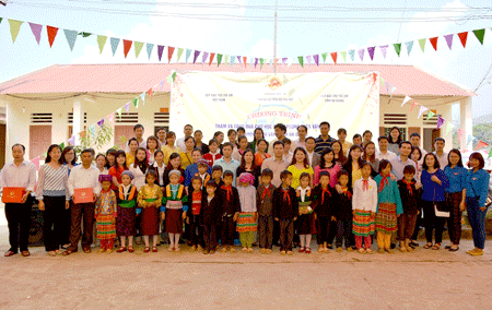 Đoàn công tác chụp ảnh lưu niệm với cô trò trường PTCS dân tộc nội trú Vần Chải. |