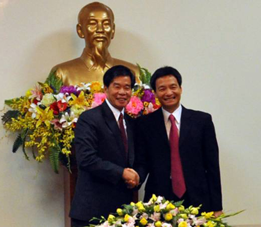 Bộ trưởng, Chủ nhiệm VPCP Việt Nam Vũ Đức Đam chào mừng Bộ trưởng, Chủ nhiệm VPCP Lào Xỉn-lạ-vông Khút-phay-thun đến thăm và làm việc tại Việt Nam. Ảnh Phan Hoàng |
