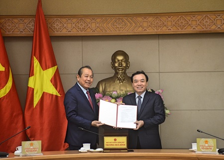 Phó Thủ tướng Thường trực Trương Hòa Bình trao sổ hưu cho nguyên Phó Chủ nhiệm VPCP Kiều Đình Thụ. Ảnh: Gia Huy |