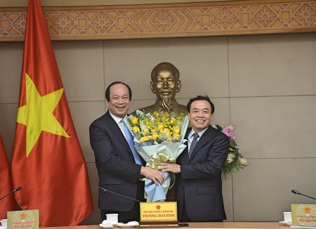 Bộ trưởng, Chủ nhiệm VPCP Mai Tiến Dũng tặng hoa cho nguyên Phó Chủ nhiệm VPCP Kiều Đình Thụ. Ảnh: Gia Huy |