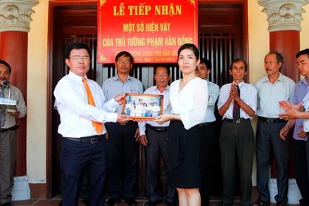 Bà Nguyễn Thị Minh Phương trao các hiện vật của cố Thủ tướng Phạm Văn Đồng cho ông Hồ Quý Nhân, Phó Giám đốc Sở VHTT&DL tỉnh Quảng Ngãi. Hồng Hạnh |