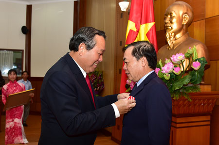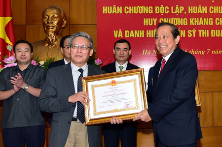 Phó Thủ tướng Trương Hòa Bình trao Huân chương Lao động hạng Nhất cho đồng chí Đỗ Doãn Thuật, Thư ký nguyên Phó Thủ tướng Phạm Gia Kiêm. |