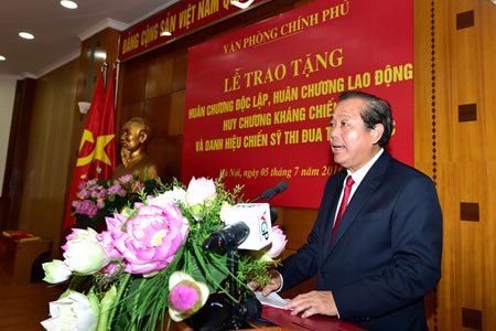 Thừa ủy quyền của Chủ tịch nước, Phó Thủ tướng Trương Hòa Bình đã trao Huân chương Độc lập hạng Nhì cho đồng chí Kiều Đình Thụ, Phó Chủ nhiệm VPCP; trao Huân chương Lao động hạng Nhất cho các đồng chí: Nguyễn Xuân Thành, Phó Chủ nhiệm VPCP; Bùi Huy Hùng, Trợ lý nguyên Thủ tướng Nguyễn Tấn Dũng; Đỗ Doãn Thuật, Thư ký nguyên Phó Thủ tướng Phạm Gia Kiêm; Thái Hiền Lương, Cục trưởng Cục Hành chính - Quản trị II.